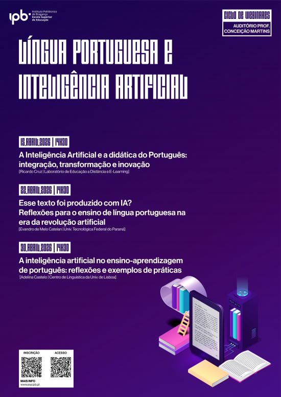 A Comissão de Curso da Licenciatura de Relações Lusófonas e Língua Portuguesa, nos dias 15, 22 e 30 de abril de 2026, organiza o Ciclo de webinares sobre Língua Portuguesa e Inteligência Artificial, atividade Científico-Pedagógica integrada no Plano de Atividades da Licenciatura de Relações Lusófonas e Língua Portuguesa para 2026. Esta atividade pretende explorar como as tecnologias de Inteligência Artificial podem apoiar e ampliar o ensino-aprendizagem do Português, apresentando ferramentas e reflexões que promovam o uso crítico, ético e inovador desses recursos. PROGRAMANo dia 15 de abril de 2026, às 14h30, ocorrerá o webinar "A Inteligência Artificial e a didática do Português – integração, transformação e inovação", proferido por Ricardo Cruz, Investigador do Laboratório de Educação a Distância e E-Learning (LE@D). No dia 22 de abril de 2026, às 14h30, ocorrerá o webinar "ESSE TEXTO FOI PRODUZIDO COM IA? REFLEXÕES PARA O ENSINO DE LÍNGUA PORTUGUESA NA ERA DA REVOLUÇÃO ARTIFICIAL", a realizar por Evandro de Melo Catelan, da Universidade Tecnológica Federal do Paraná. No dia 30 de abril, às 14h30m, realizar-se-á o webinar "A inteligência artificial no ensino-aprendizagem de português: reflexões e exemplos de práticas", proferido por Adelina Castelo, do Centro de Linguística da Universidade de Lisboa. Local: Auditório Professora Conceição Martins e plataforma Zoom Link de acessoInscriçãoA participação no Ciclo de webinares sobre Língua Portuguesa e Inteligência Artificial é gratuita, mas carece de inscrição obrigatória.