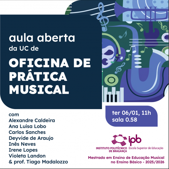 O ano começa com música na ESE: na terça-feira, dia 06 de janeiro, pelas 11h, a turma da UC de Oficina de Prática Musical do curso de Mestrado em Ensino de Educação Musical no Ensino Básico promoverá uma aula aberta com o repertório trabalhado ao longo das aulas.