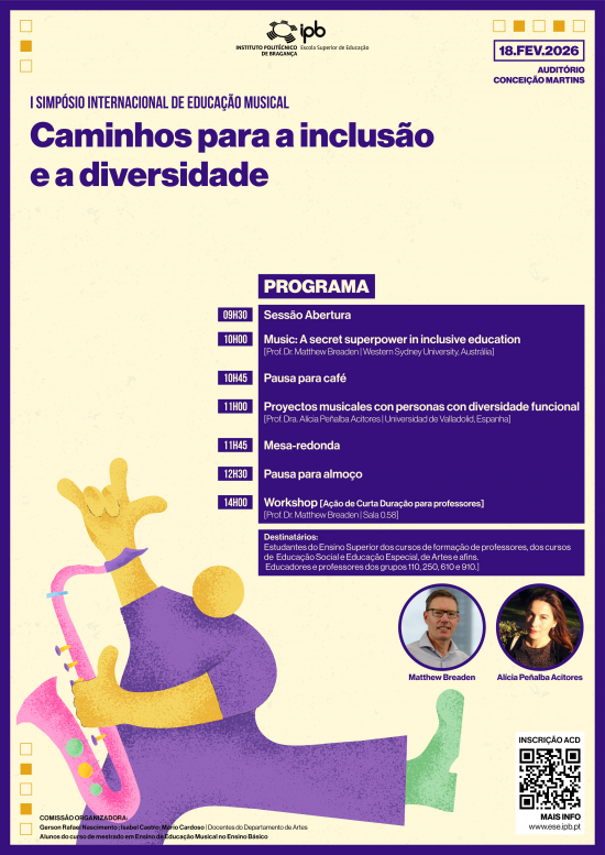 Este evento, creditado para docentes dos grupos de recrutamento 110, 250, 610 e 910, reunirá professores, investigadores, estudantes e especialistas internacionais num encontro que pretende aprofundar o conhecimento sobre práticas pedagógico-musicais inclusivas.