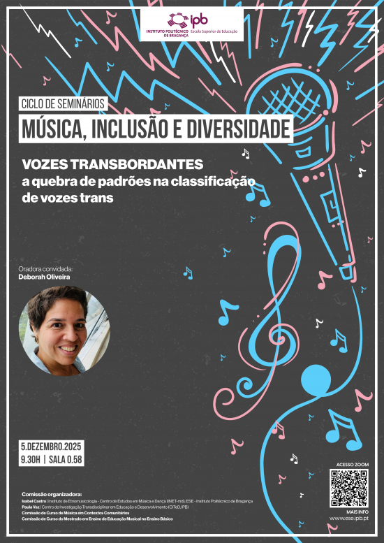 No âmbito da unidade curricular de Música, Inclusão e Diversidade, do Curso de Mestrado em Ensino de Educação Musical no Ensino Básico, as Comissões de Curso Mestrado em Ensino de Educação Musical no Ensino Básico, do curso de Música em Contextos Comunitários e as docentes Isabel Castro e Paula Vaz, organizam um ciclo de Seminários intitulado: Música, Inclusão e Diversidade. O primeiro Seminário, a realizar dia 5 de dezembro de 2025, às 9.30h, em regime online e presencial (sala 0.58) conta com a participação da Professora Doutora Deborah Oliveira (Universidade Federal do Piauí) que apresenta a temática - VOZES TRANSBORDANTES: a quebra de padrões na classificação de vozes trans