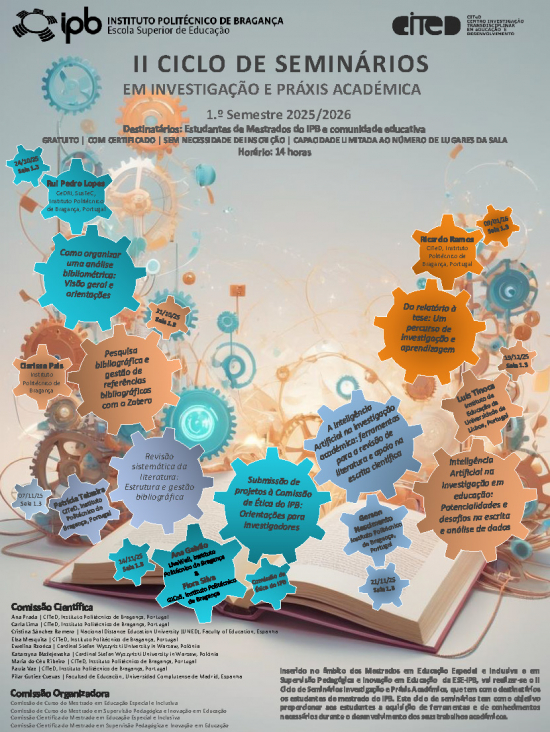 Inserido no âmbito dos Mestrados em Educação Especial e Inclusiva e em Supervisão Pedagógica e Inovação em Educação da ESE-IPB, vai realizar-se o II Ciclo de Seminários Investigação e Práxis Académica, que tem como destinatários os estudantes de mestrado do IPB. Este ciclo de seminários tem como objetivo proporcionar aos estudantes a aquisição de ferramentas e de conhecimentos