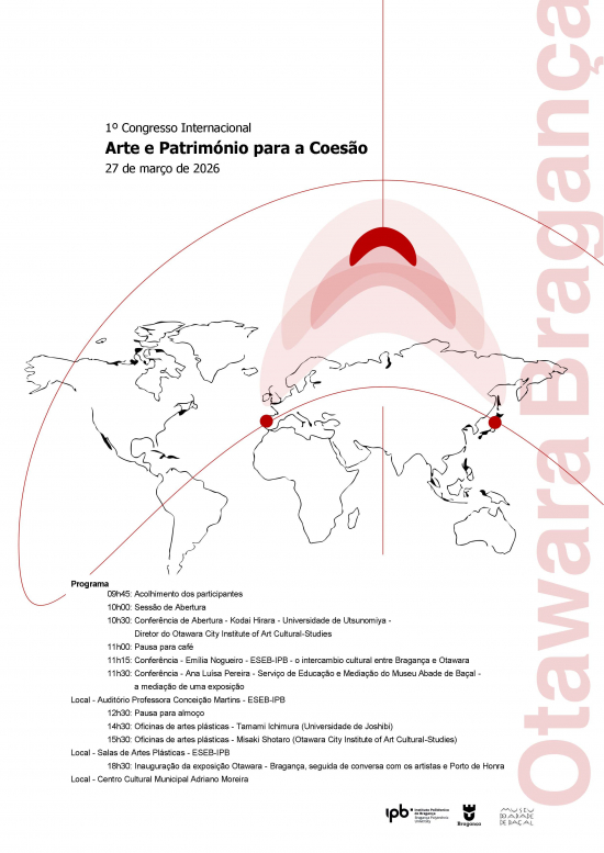 A Escola Superior de Educação do Instituto Politécnico de Bragança (ESE/IPB), o Otawara City Institute of Art Cultural-Studies (Japão) e o Museu Abade de Baçal promovem, no dia 27 de março de 2026, o Congresso Internacional de Arte e Património para a Coesão, a realizar na ESE/IPB, em Bragança. O congresso constitui um espaço de partilha e valorização da prática artística e do património artístico enquanto processos promotores da coesão entre instituições, a comunidade académica e a sociedade civil de territórios afastados dos grandes centros populacionais. O Congresso Internacional de Arte e Património para a Coesão, acreditado pela ESE/IPB como Ação de Formação de Curta Duração (5 horas) para docentes de todos os grupos disciplinares, é parte de um projeto de intercâmbio cultural entre Portugal e o Japão, mais concretamente entre Bragança e Otawara que se operacionaliza também numa Residência Artística – 27 a 30 de março de 2026 e uma Exposição Coletiva – 27 de março a 27 de abril de 2026. No final do congresso, terá lugar a inauguração da exposição coletiva Otawara-Bragança no Centro Cultural Municipal Adriano Moreira em Bragança.