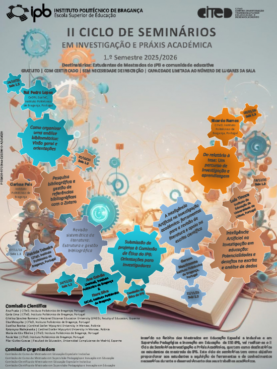 Inserido no âmbito dos Mestrados em Educação Especial e Inclusiva e em Supervisão Pedagógica e Inovação em Educação da ESE-IPB, vai realizar-se o II Ciclo de Seminários Investigação e Práxis Académica, que tem como destinatários os estudantes de mestrado do IPB. Este ciclo de seminários tem como objetivo proporcionar aos estudantes a aquisição de ferramentas e de conhecimentos