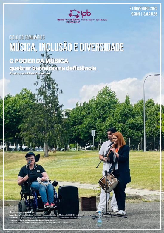 No âmbito da unidade curricular de Música, Inclusão e Diversidade, do Curso de Mestrado em Ensino de Educação Musical no Ensino Básico, as Comissões de Curso Mestrado em Ensino de Educação Musical no Ensino Básico, do curso de Música em Contextos Comunitários e as docentes Isabel Castro e Paula Vaz, organizam um ciclo de Seminários intitulado: